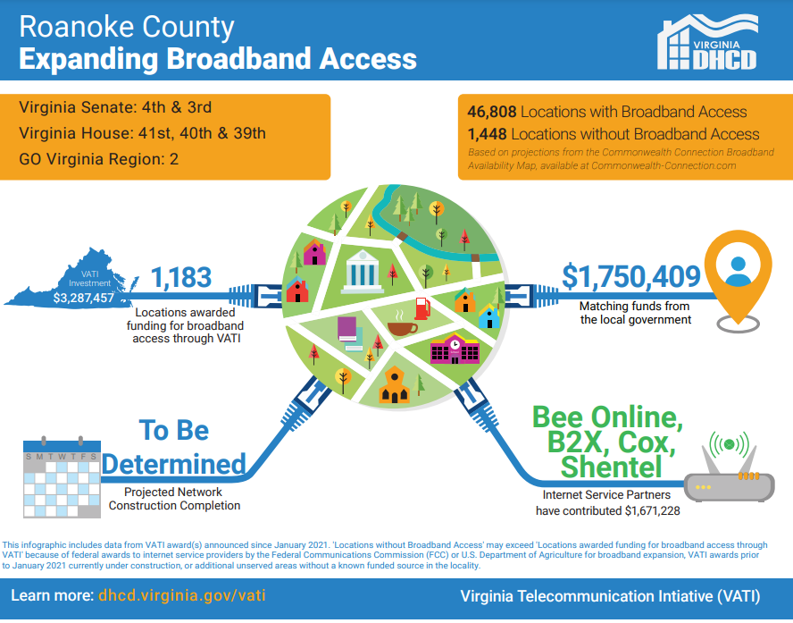 ہاؤسنگ اور کمیونٹی ڈویلپمنٹ کے محکمے نے ورجینیا کاؤنٹیز اور شہروں کے لیے براڈ بینڈ پروفائلز شائع کیے ہیں تاکہ ان کے دائرہ اختیار میں Virginia Telecommunication Initiative (VATI) کی سرمایہ کاری کا جشن منایا جا سکے۔ ان انفوگرافکس میں جنوری 2021 سے اعلان کردہ VATI ایوارڈز کا ڈیٹا شامل ہے اور VATI پروجیکٹس میں کلیدی شراکتوں کی نشاندہی کرتا ہے، بشمول VATI پروجیکٹس کے ذریعے کاؤنٹی یا شہر میں مقامی حکومت اور انٹرنیٹ سروس فراہم کنندہ کی سرمایہ کاری۔ دولت مشترکہ میں انٹرنیٹ سروس فراہم کنندگان کی طرف سے پیش کردہ سروس ٹیریٹری ڈیٹا کے مطابق، انفوگرافکس ان مقامات کی بھی نشاندہی کرتا ہے جنہیں VATI کے ذریعے براڈ بینڈ تک رسائی کے لیے فنڈنگ دی گئی ہے، ساتھ ہی براڈ بینڈ تک رسائی کے ساتھ پیش کیے گئے اور غیر محفوظ مقامات کی تعداد کے ساتھ۔