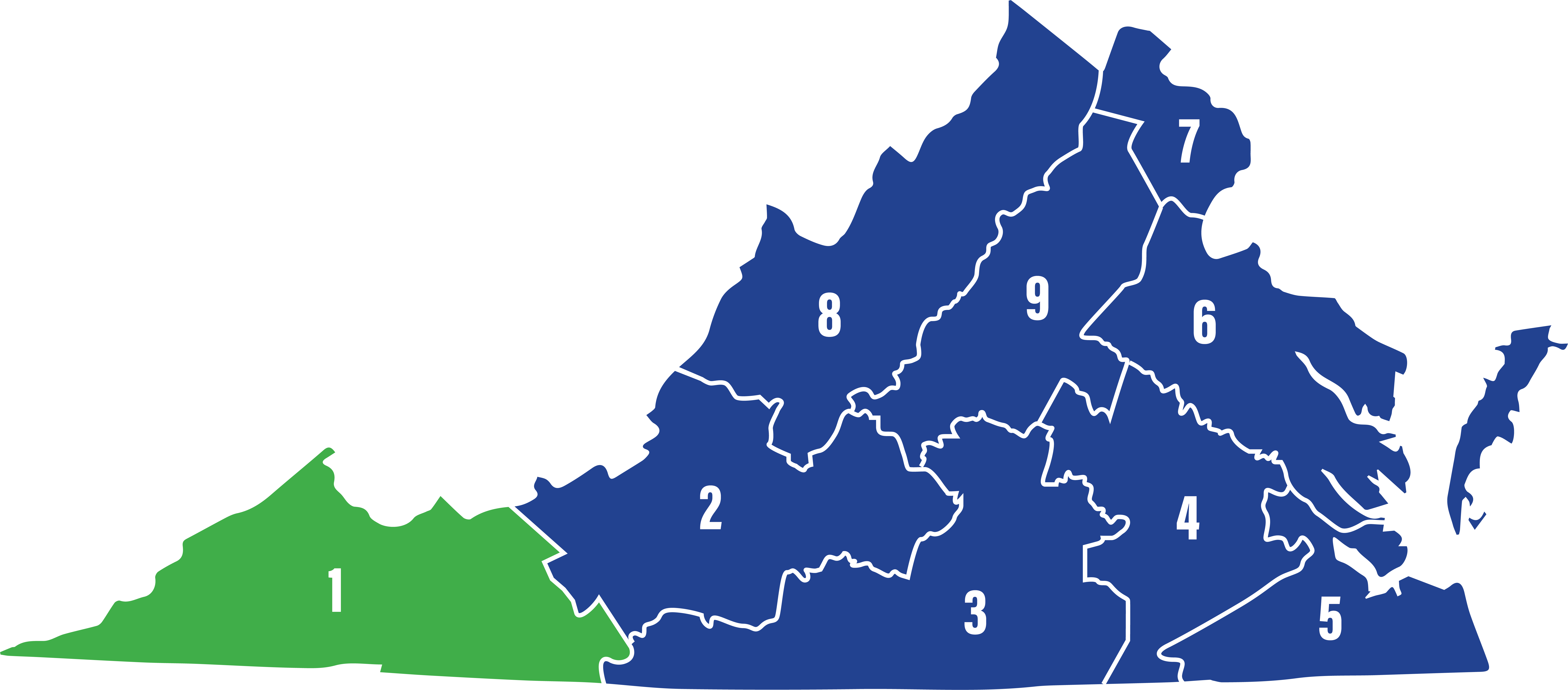 ریجن ون میں بلینڈ، بوکانن، کیرول، ڈکنسن، گریسن، لی، رسل، اسکاٹ، سمتھ، ٹیز ویل، واشنگٹن، وائز اور وائیتھ اور برسٹل، گیلیکس اور نورٹن کے شہر شامل ہیں۔ Appalachian پہاڑ بہت سے 13 کاؤنٹیوں اور تین شہروں سے گزرتے ہیں جو اس علاقے پر مشتمل ہیں۔